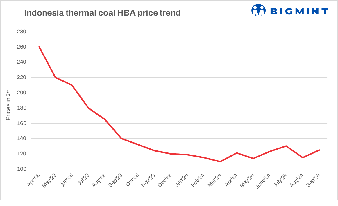 Indonesia’s benchmark coal prices, also known as Harga Batubara Acuan (6,322 kcal/kg GAR) increased by 9% m-o-m in Sep’24. HBA prices in Sep’24 were revised to $125.15/t. Prices of the 5,300 kcal/kg GAR grade were recorded at $85.01/t. Prices of 4,100 kcal/kg GAR and 3,400 kcal/kg GAR were recorded at $53.26/t and $35.89/t, respectively.