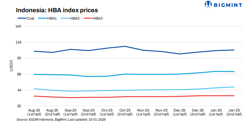 Indonesia’s Ministry of Energy and Mineral Resources (ESDM) has revised its thermal coal benchmark prices (HBA) for the second half of January 2026, indicating a broadly firm price environment across most calorific value (CV) segments.