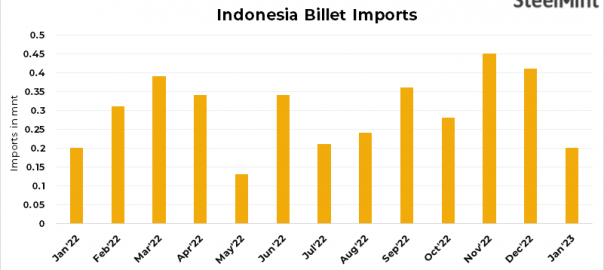 • Indonesia’s steel billets imports witnessed a sharp decrease of 50% m-o-m to 205,237 t in Jan’23 as against 406,192 t in Dec’22, as per customs data.
