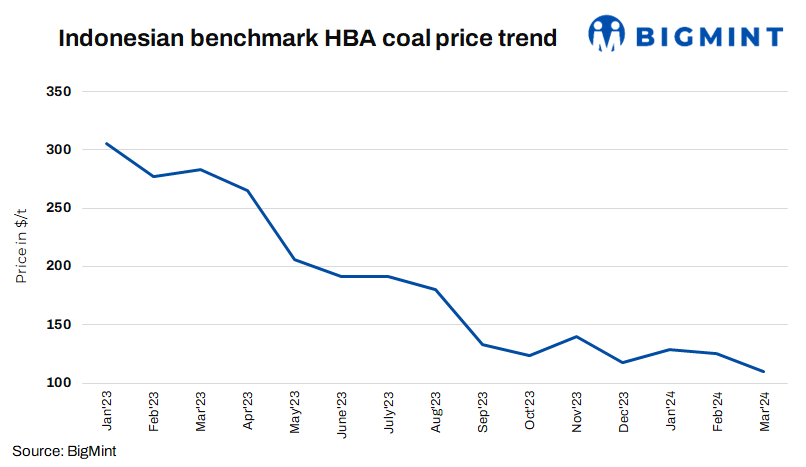 Indonesia’s benchmark coal price, also known as Harga Batubara Acuan (6,322 kcal/kg GAR) drop by 12.15% m-o-m in Mar’24. The HBA prices in Mar’24 revised to $109.77/t. The prices for the 5,300 kcal/kg GAR grade are recorded at $88.77/t. Prices for 4,100 kcal/kg GAR and 3,400 kcal/kg GAR recorded at $56.83/t and $37.60/t respectively.