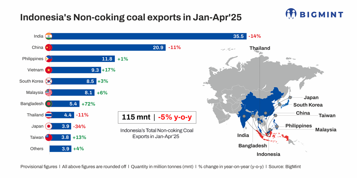 Morning Brief: Indonesian coal exports decreased by 5% y-o-y in January-April 2025 to 115 million tonnes (mnt) compared with 121 mnt in the corresponding period of last year, as per provisional data with BigMint. The country exported 565 mnt of coal in CY’24, an increase of 8% from 524 mnt recorded in CY’23.