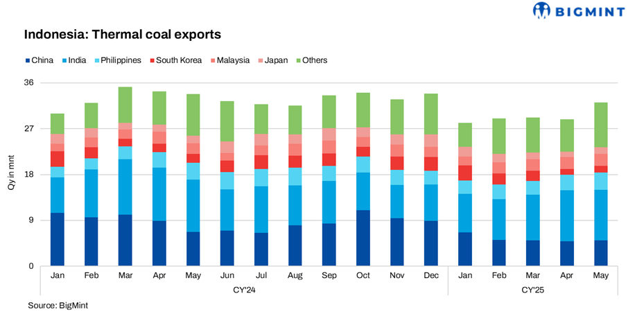 Indonesia’s thermal coal exports rose sharply by 11.3% month-on-month (m-o-m) in May 2025, reaching 32.14 million tonnes (mnt), up from 28.88 mnt in April. However, the export volume remained 5% lower year-on-year (y-o-y) compared to May 2024.