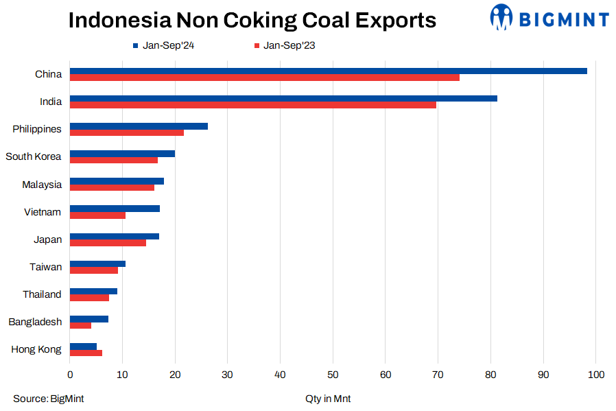 Indonesian coal exports rose by 23% y-o-y in January-September, 2024, reaching 320.07 million tonnes (mnt) compared to 260.79 mnt in January-September, 2023, as per vessel lineup data from BigMint. In January-September, 2024, Indonesian non-coking coal exports stood at 317.41 mnt, increasing by 22.4% from 259.24 mnt in January-September, 2023.