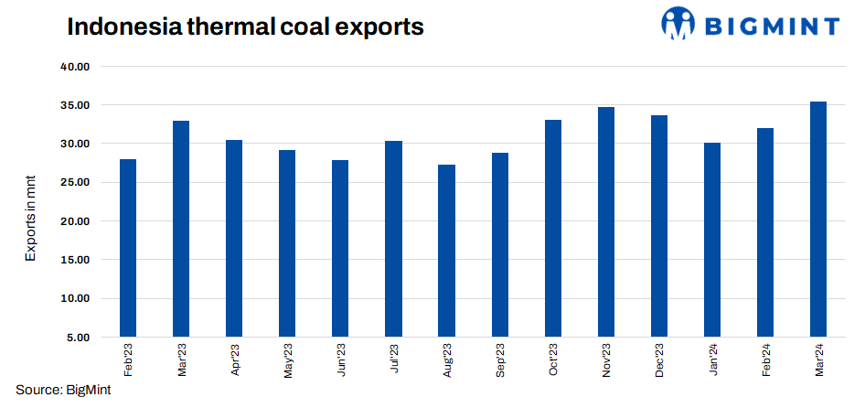 Indonesian thermal coal exports increased by 10% m-o-m to 35.24 million tonnes (mnt) in March 2024 as against 32.04 mnt in February 2024. However, exports increased by 7% y-o-y to 35.24 mnt in March 2024 as against 32.98 mnt in March 2023. The increase in Indonesian thermal coal exports can be attributed to the easing of supply constraints and improved demand from major importing countries.