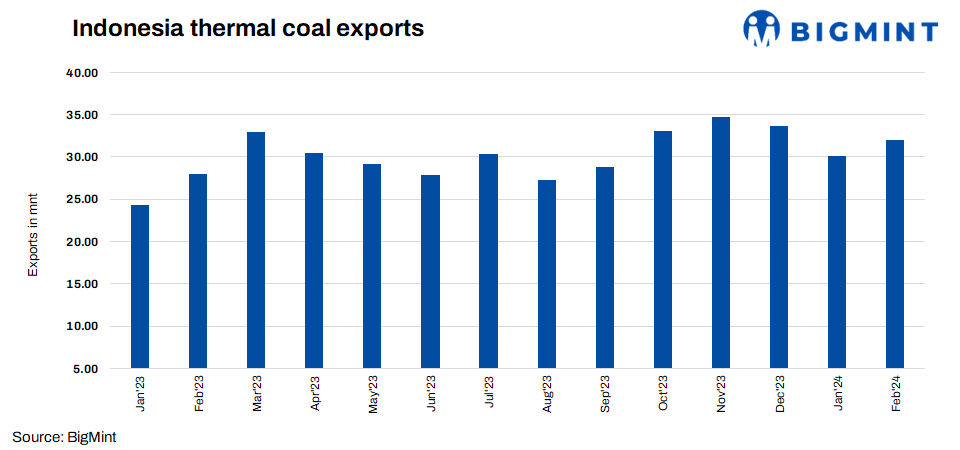 Indonesian thermal coal exports rose by 7% m-o-m to 32.04 million tonnes (mnt) in February 2024 as against 29.99 mnt in January 2024. However, exports increased by 13% y-o-y to 32.04 mnt in February 2024 as against 28.02 mnt in February 2023. Indonesia’s thermal coal exports increased due to demand from Asian countries, supported by the approval of production quotas in response to rising power demand.