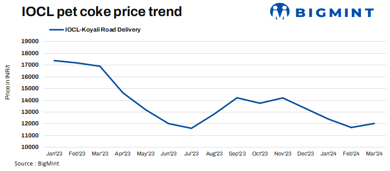 Indian Oil Corporation Limited (IOCL) has increased fuel grade pet coke prices for Mar’24. Prices at Koyali refinery for road delivery rose to INR 12,010/t against the last price of INR 11,670/t. Prices in Panipat refinery rose to INR 13120, Paradip prices are stable at INR 10,820 and Haldia unchanged at INR 10,990/t. The rake prices have seen a rise by up to INR 340/t at Koyali.