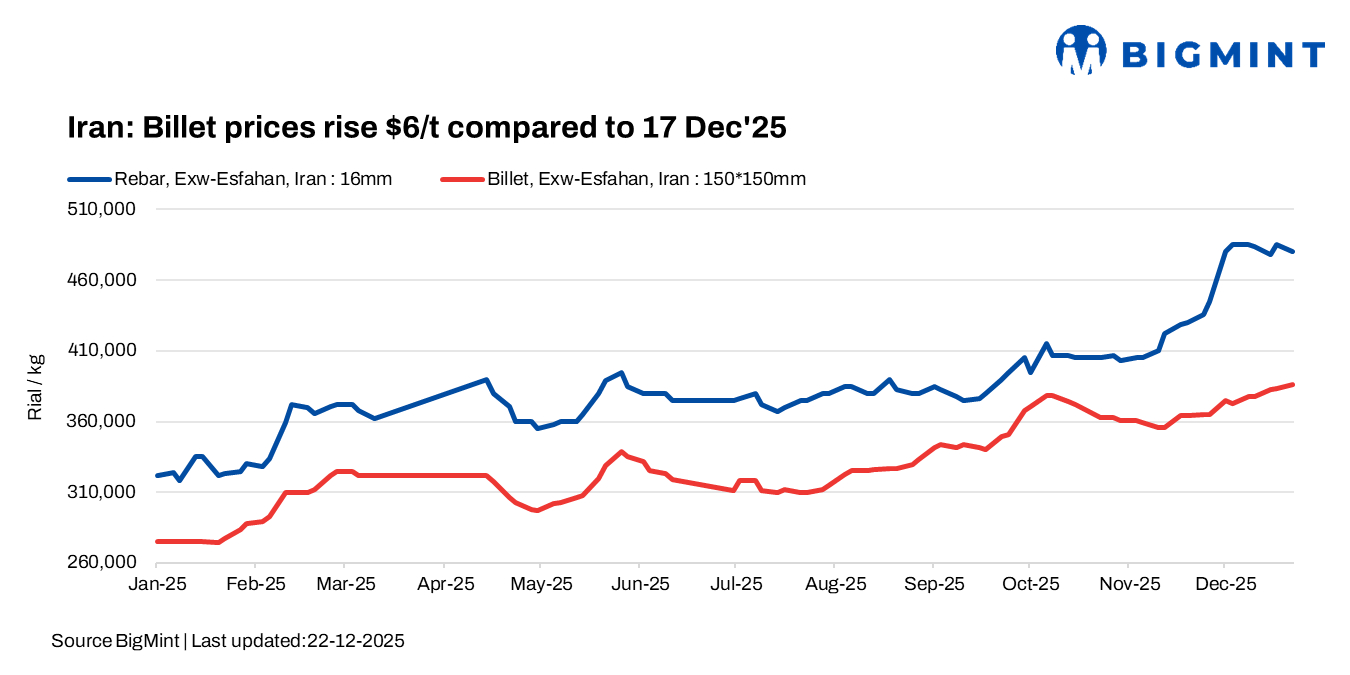 - Iran’s billet prices rose by 2,500 rial/kg ($6/t, 0.7%) to 386,000 rials/kg ($919/t) on 22 Dec, while rebar prices fell by 5,000 rial/kg ($12/t, 1%) to 480,000 rials/kg ($1,142/t).