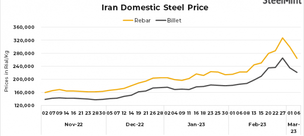 - Billet prices decreased by 130,500 Rial/kg to 221,500 Rial/kg as against 1 Mar’23.