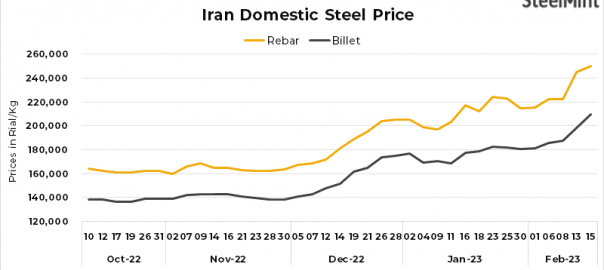 - Steel billet prices rose sharply by 11,000 Rial/kg to 209,500 Rial/kg as against 13 Feb’23.