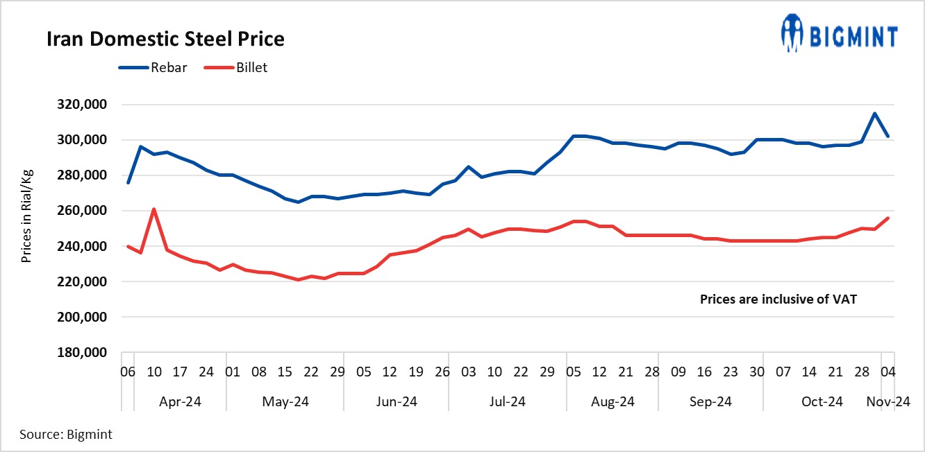 - Billet prices rose by 6,500 Rial/kg to 256,000 Rial/kg on 4 Nov’24 as against 30 Oct.