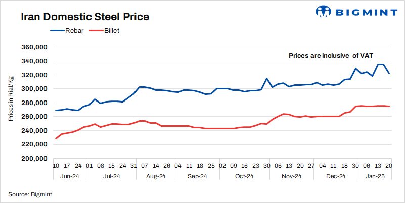 • Rebar prices decreased by 13,000 Rial/kg to 322,000 Rial/kg on 20 Jan’25 as against 15 Jan.
