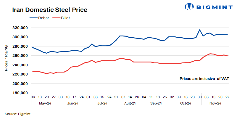 - Rebar prices stood stable at 306,000 Rial/kg on 27 Nov’24 against 25 Nov.