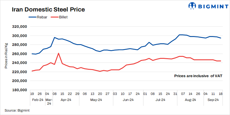 - Billet prices remained stable at 244,000 Rial/kg on 18 Sep’24 as against 16 Sep’24.
