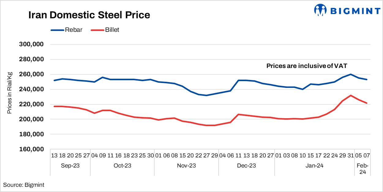 - Billet prices fell by 4,500 Rial/Kg to 221,500 Rial/Kg as against 5 Feb.