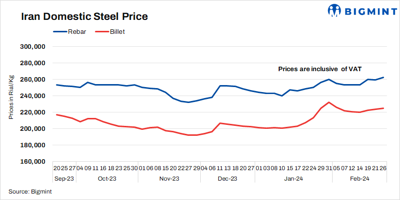 - Billet prices rose by 1,000 Rial/Kg to 224,500 Rial/Kg as against 21 Feb.
