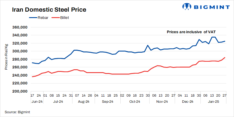 • Rebar prices increased by 2,000 rial/kg to 325,000 rial/kg on 27 Jan’25 as against 22 Jan.