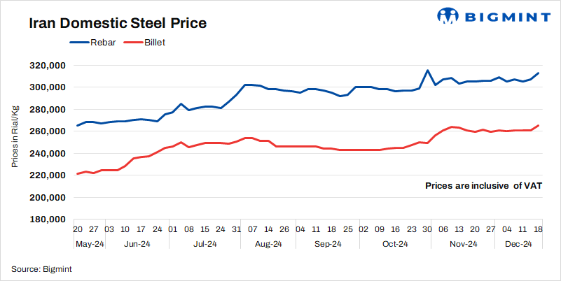 • Billet prices rose by 5,000 rial/kg to 265,500 rial/kg on 18 Dec’24 as against 16 Dec.