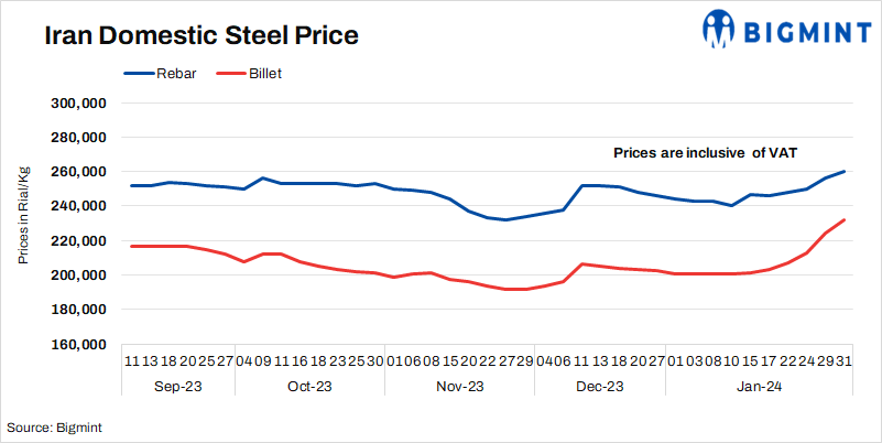 Iran’s domestic billet and rebar prices continued their uptrend amid ex-rate fluctuation, limited DRI production and supply concerns, sources informed BigMint.