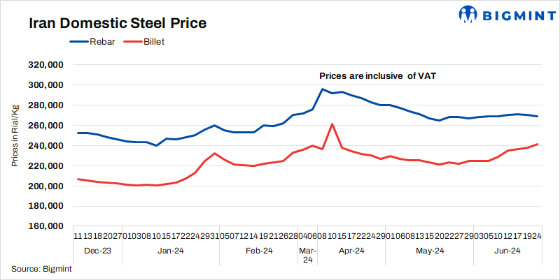 - Billet prices rose by 3,500 rial/kg to 241,000 rial/kg as against 19 June.