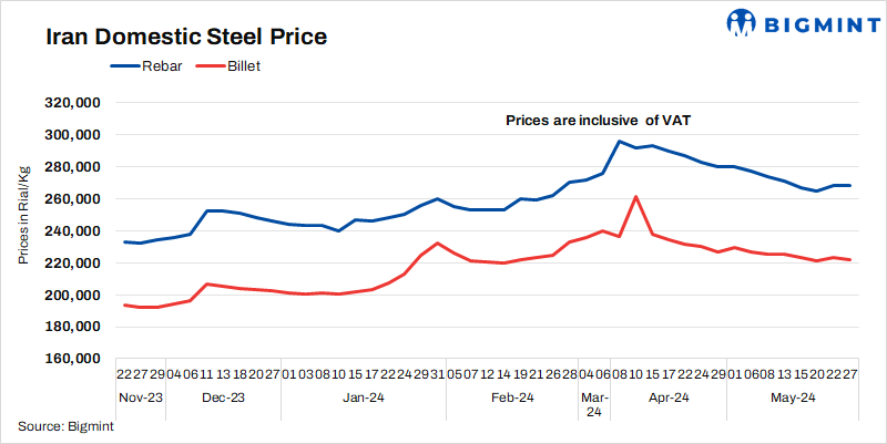 - Billet prices fell by 1,000 rial/kg to 222,000 rial/kg as against 22 May.