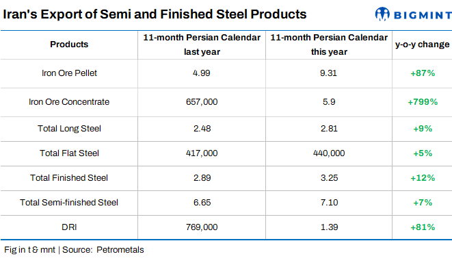 • Meanwhile, direct reduced iron (DRI) exports surged by 81% y-o-y to 1.39 mnt.