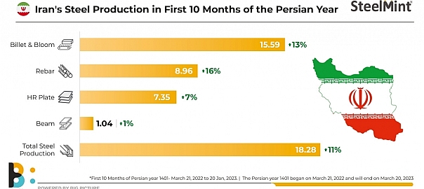 Iran’s steel production increased by 11% in the first ten months of the current Persian year (March, 2022-January, 2023), according to data released by the Iranian Steel Producers Association (ISPA).