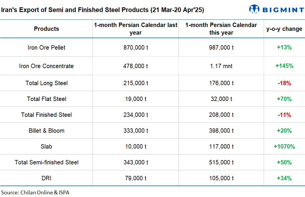 Iran’s semi-finished steel exports in the first month of the current Persian Year (21 March-20 April 2025) surged by 50% y-o-y, while production edged up by 4.6%, according to data from the Iranian Steel Producers Association (ISPA). This is despite ongoing power restrictions and shortages, which have impacted Iran’s industrial operations.