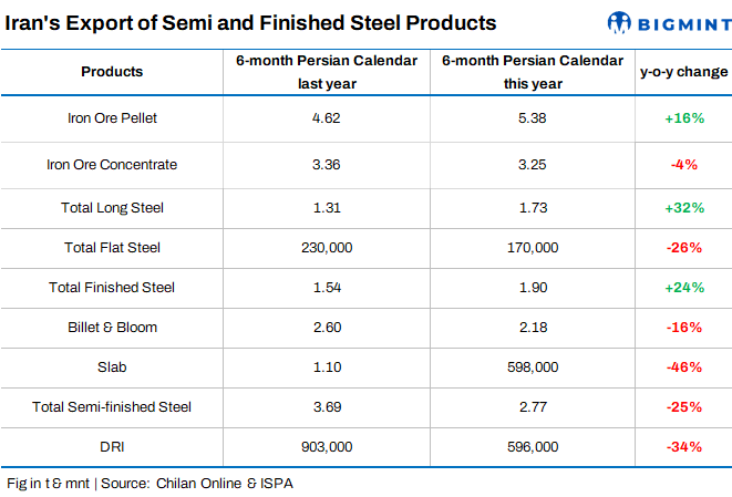 Out of the total semi-finished steel exports, volumes of billet and bloom stood at 2.18 mnt, a 16% drop y-o-y while slab exports fell significantly by 46% y-o-y to 598,000 tonnes (t).