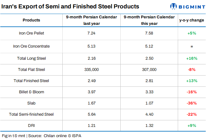 Meanwhile, exports of direct reduced iron (DRI) in the period under review were recorded at 1.32 mnt, a rise of around 9% y-o-y.