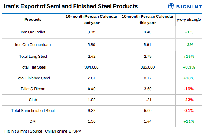 Meanwhile, exports of direct reduced iron (DRI) in the period under review were recorded at 1.44 mnt, a rise of around 11% y-o-y.