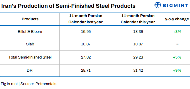Iran’s semi-finished steel production increased marginally in the eleven months of current Persian year (21 March 2023-20 February, 2024), according to data released by Petrometals.