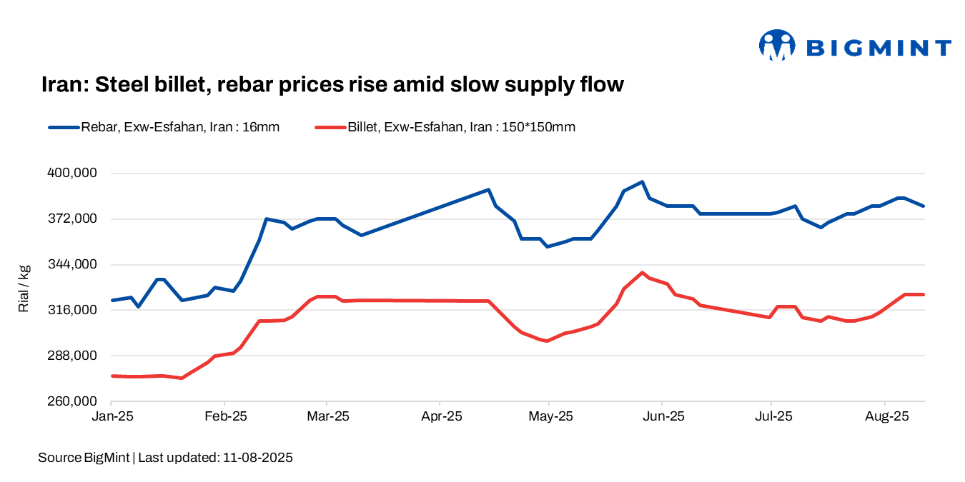 - Iran’s billet price held steady at 325,500 rial/kg, and rebar price dropped by 5,000 rial/kg to 380,000 rial/kg on 11 Aug’25.