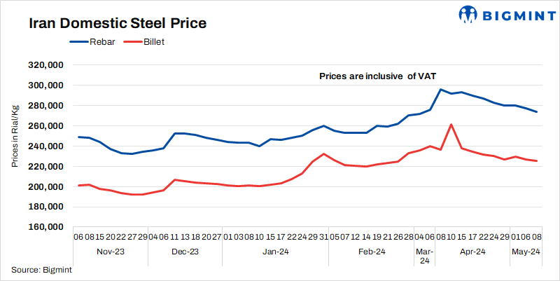 - Billet prices fell by 1,000 Rial/kg to 225,500 Rial/kg as against 6 May.
