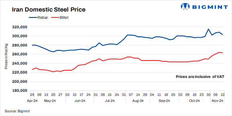 - Billet prices fell by 1,000 Rial/kg to 263,000 Rial/kg on 13 Nov’24 as against 11 Nov.