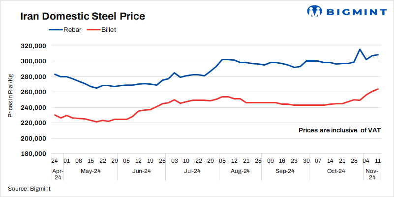 - Billet prices rose by 3,500 Rial/kg to 264,000 Rial/kg on 11 Nov as against 6 Nov.