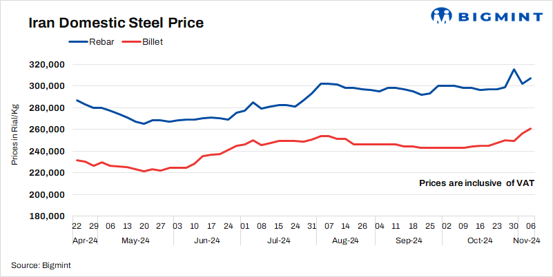 - Billet prices rose by 4,500 Rial/kg to 260,000 Rial/kg on 6 Nov’24 as against 4 Nov.