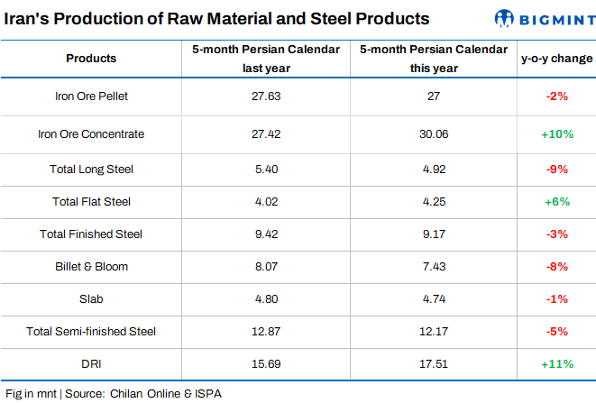 Iran: Steel production drops 3% y-o-y in first 5 months of current Persian year