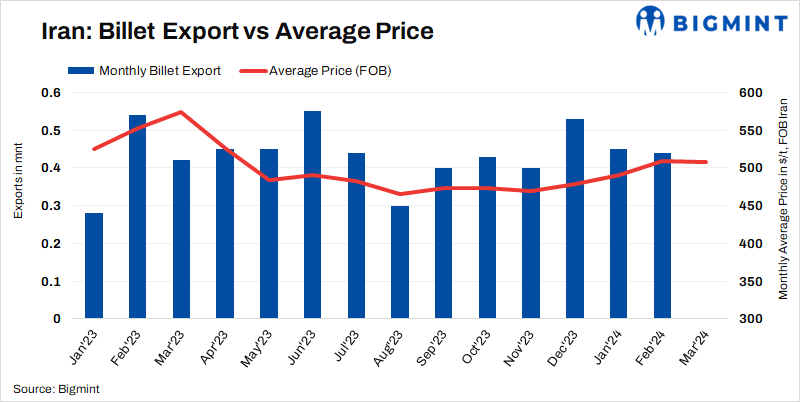 An Iranian steel mill has concluded an export tender for 40,000 t of billets (150mm), sources informed. The deal was heard concluded at $484/t FOB for May’24 delivery. Prices decreased to over three-month low. Iran’s exports of semi-finished steel totalled 7.10 mnt, in the first eleven months of the current Persian year (21 March-20 February, 2024), up by 7% y-o-y, according to data from ISPA.