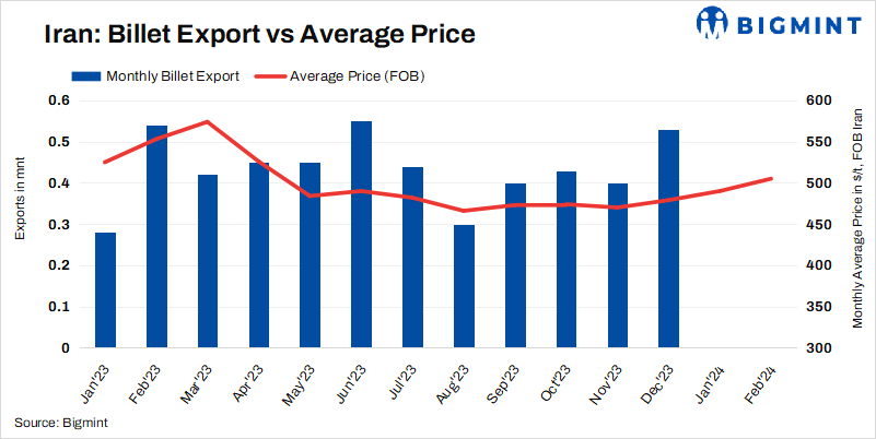 An Iranian steel mill has concluded an export tender for 30,000 tonnes (t) of billets, sources informed. The deal was heard concluded at $510/t FOB for mid-April, 2024 delivery. According to BigMint’s latest assessment, Iran’s billet (3SP) export prices inched up by $10/t w-o-w to stand at $510/t FOB on 6 February, 2024.