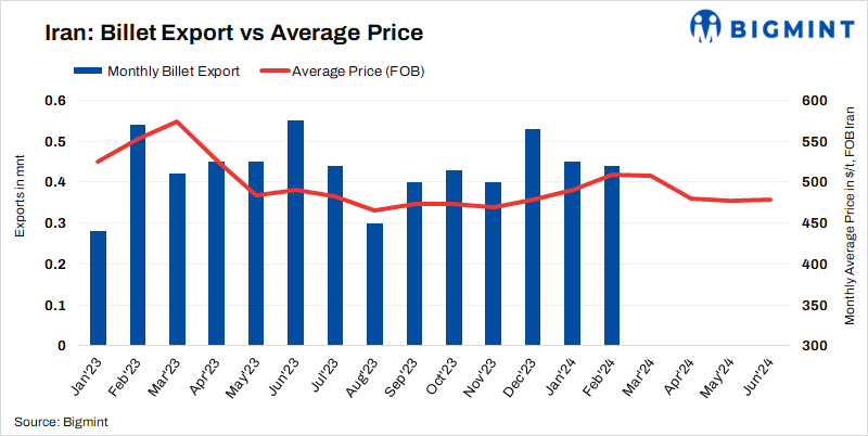 According to BigMint’s latest assessment, Iran’s billet (3SP) export prices inched up by $4/t w-o-w to $482/t FOB on 12 June, 2024.