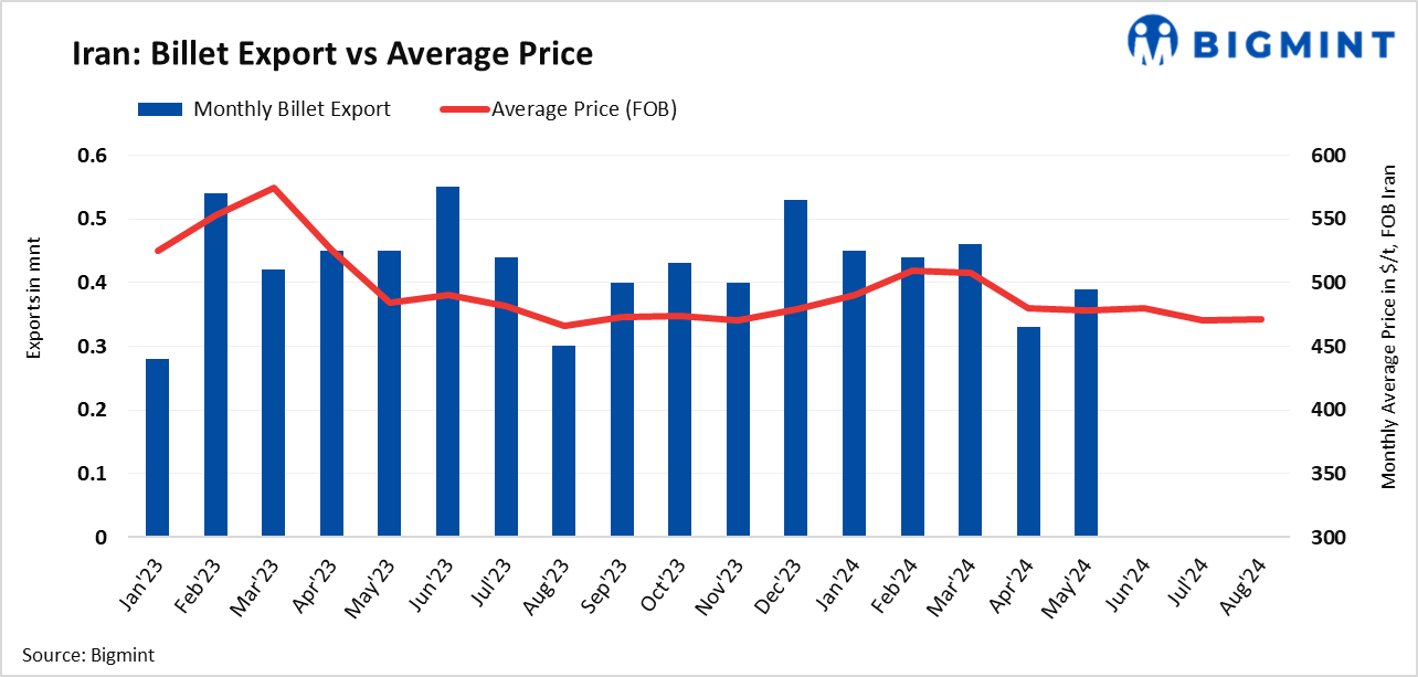 An Iranian steel mill has concluded an export tender for 25,000 t of billets for mid-Oct’24 shipment. The deal was heard concluded at $472/t FOB, as per sources. Iran’s semi-finished steel exports in the first three months of the current Persian year (21 Mar-20 Jun’24) stood at 1.57 mnt, a decrease of 26% compared to the same period last year.