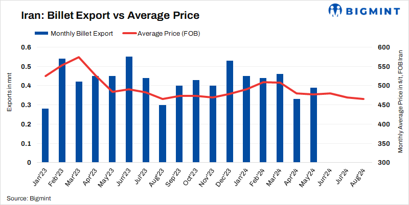 An Iranian steel mill has concluded an export tender for 30,000 t of billets for late September shipment, sources informed. The deal was heard concluded at $465/t FOB. Iran’s semi-finished steel exports in four months of the current Persian year (21 Mar-20 Jul’24) reached 2.13 mnt, marking a 23% decrease compared to the same period last year, according to data from Iranian Steel Producers Association (ISPA).