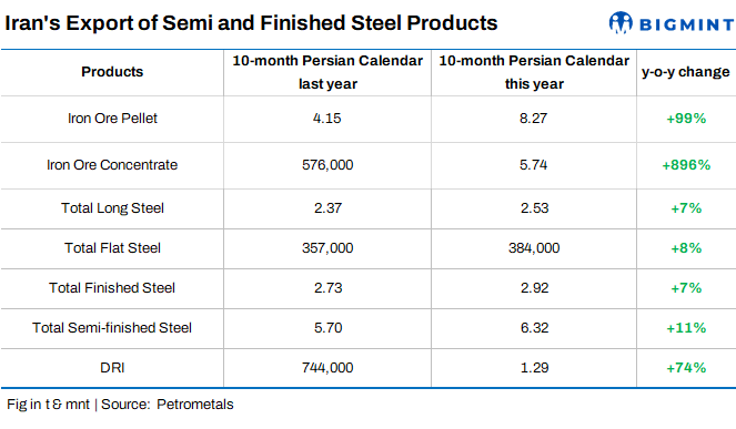 An Iranian mill has concluded an export deal for 30,000 t of P-DRI. The deal was concluded at around $340-345/t FOB (equivalent to $335 exw) for end Mar-early Apr’24 shipment. Iran’s DRI exports in the first 10 months of the current Persian year (21 March-20 January, 2024) stood at 1.29 mnt, registering a 74% growth compared to the same period last year, according to petrometals.