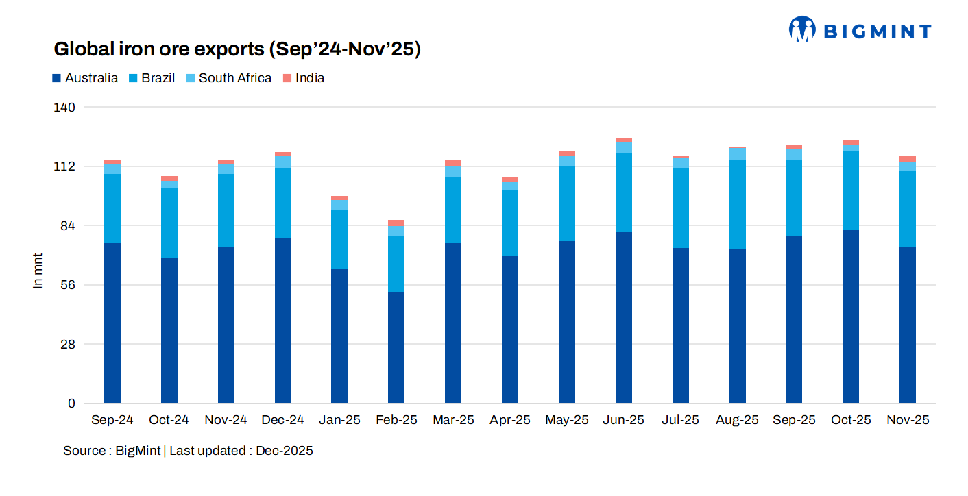 In November, with provisional data showing that overall volumes were lower, iron ore exports from Australia, Brazil, South Africa and India showed mixed trends. Total shipments stood at 117 mnt, down 6% from 124.45 mnt in October. India’s exports rose by 27% m-o-m as post-monsoon supply improved and miners released fresh material. South Africa and India recorded gains, while Australia and Brazil saw declines during the month.