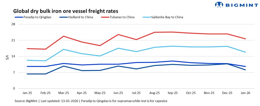 Dry bulk iron ore freights slipped w-o-w as of 13 Jan’26 on higher vessel availability and cautious Chinese buying, with the conclusion of some fixtures at lower levels pressuring overall rates.