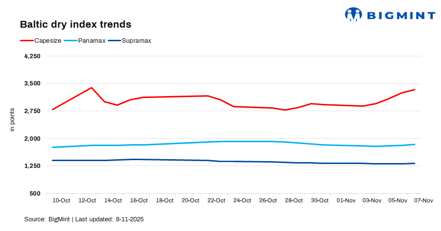 The Baltic Exchange’s dry bulk index rose 41 points d-o-d to 2,104 on 7 Nov’25, amid stronger Capesize demand, supported by increased iron ore shipments from Brazil and Australia to China. Panamax and Supramax segments also gained amid steady grain and coal trade flows.