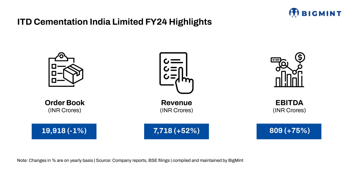 ITD Cementation India Limited has posted 52% y-o-y rise in revenue to INR 7,718 crores in FY’24 against INR 5,091 crores in FY’23. The company’s order book stood at INR 19,918 crores as of Mar’24 and orders worth INR 6,900 crores were secured in FY’24. The operating EBITDA witnessed 75% surge y-o-y to INR 809 crores in FY’24 against INR 463 crores in previous year.