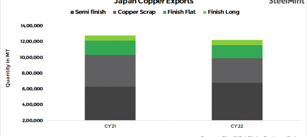 - Japan’s copper exports dropped 5% to 1.21 mnt in CY’22 as against CY’21.