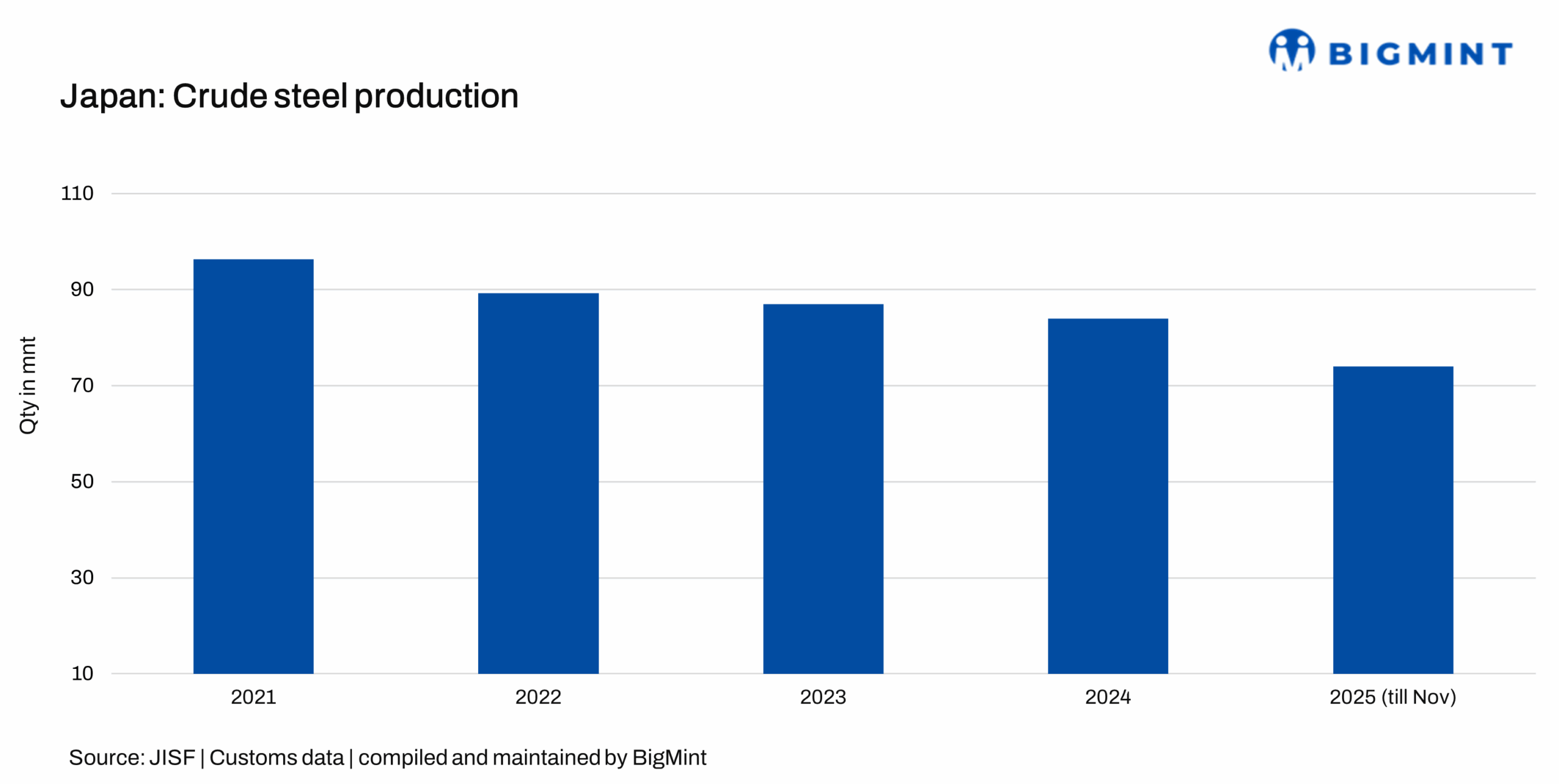 Japan Metal Daily: Japan’s crude steel production declined by 1.6% y-o-y to 6.774 million tonnes (mnt) in November 2025, according to the Japan Iron and Steel Federation (JISF). This marked the eighth consecutive month of y-o-y decline, with steelmakers continuing to operate at lower production levels amid weak demand in both domestic and global markets.