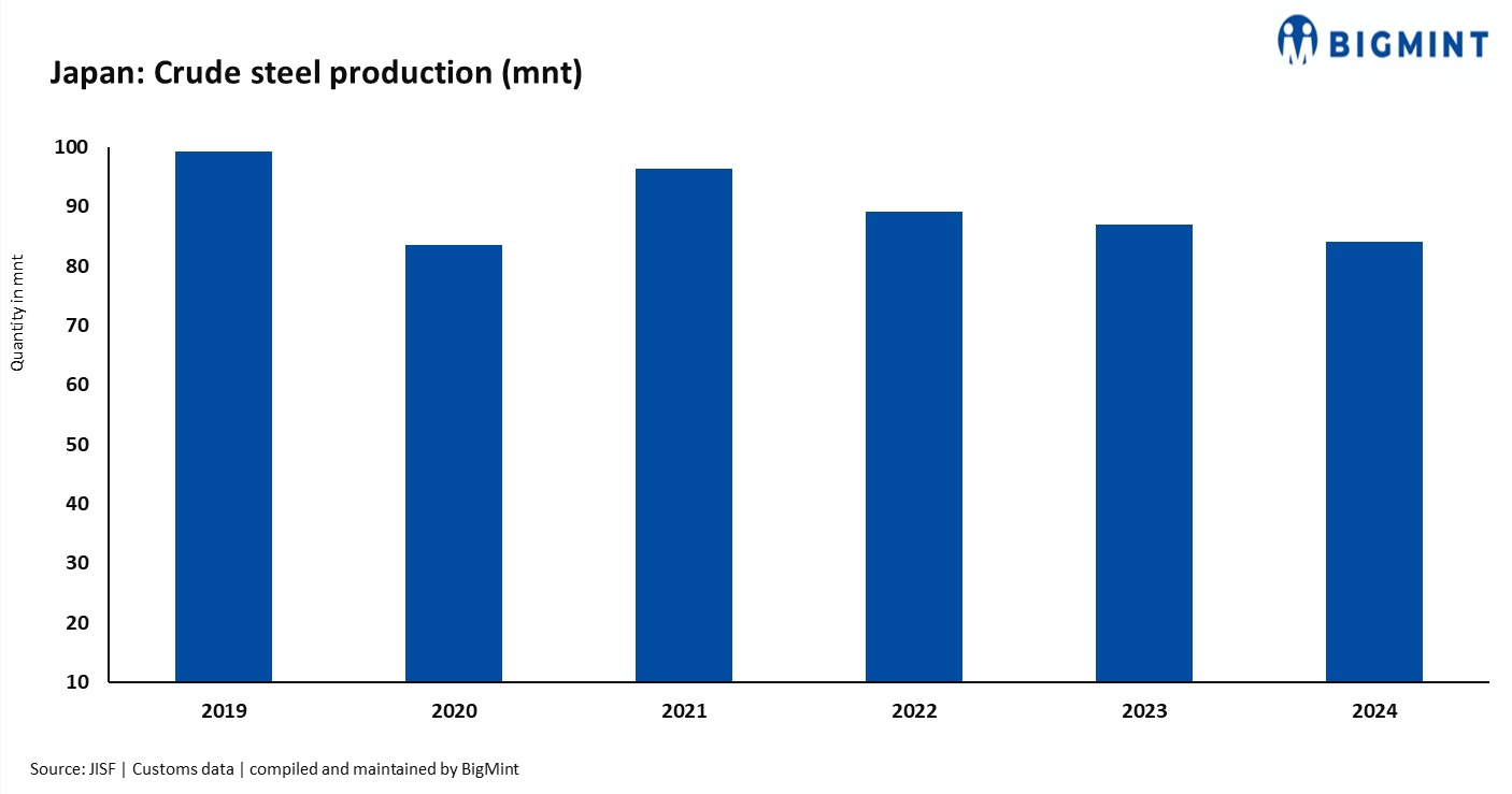 Japan Metal Daily: Japan’s domestic crude steel production decreased by 3.4% y-o-y to 84 million tonnes (mnt) in CY’24, marking the third consecutive year of decline, according to a preliminary report released by the Japan Iron and Steel Federation (JISF). This downturn is attributed to both weak domestic and export demand, which has forced steelmakers to maintain low production levels.